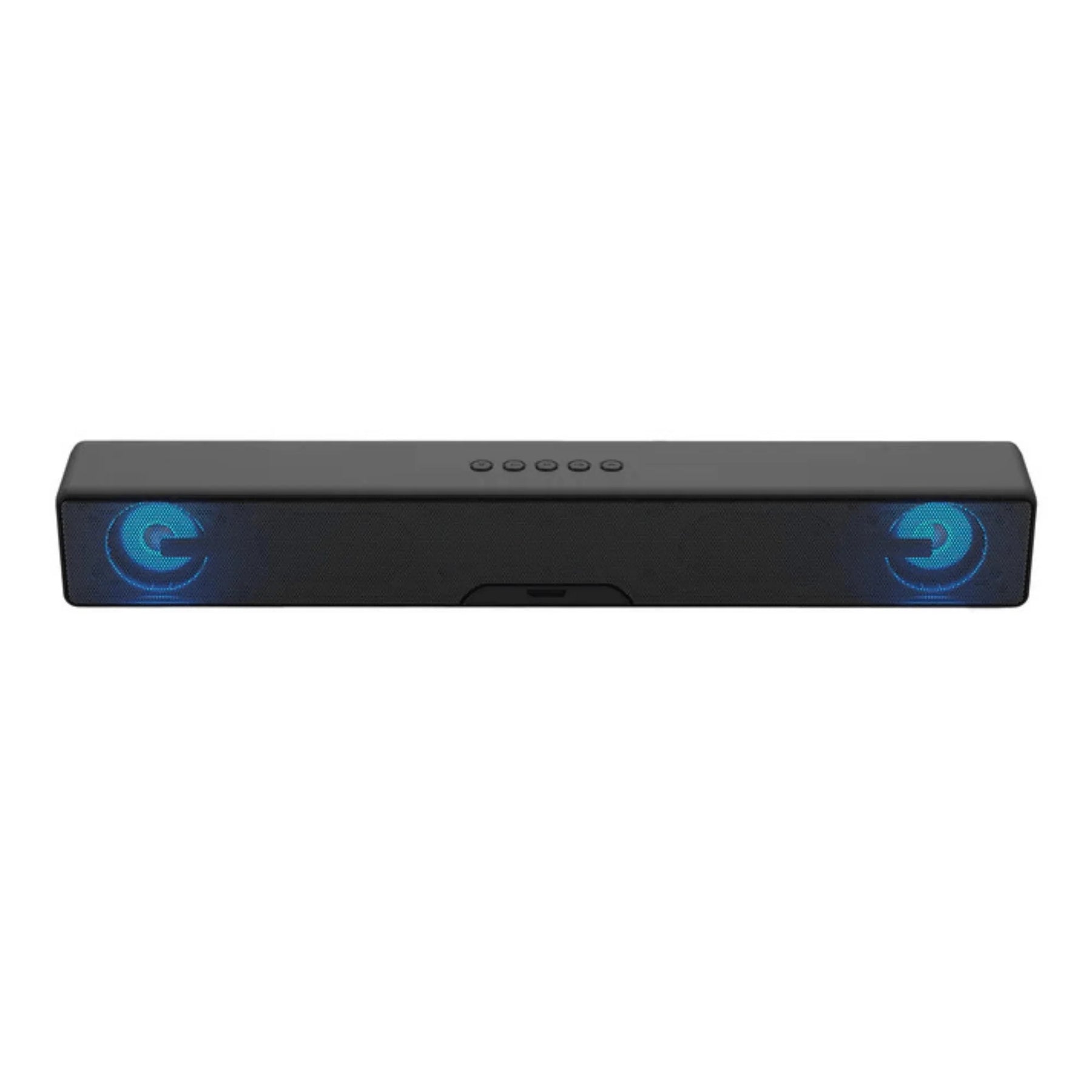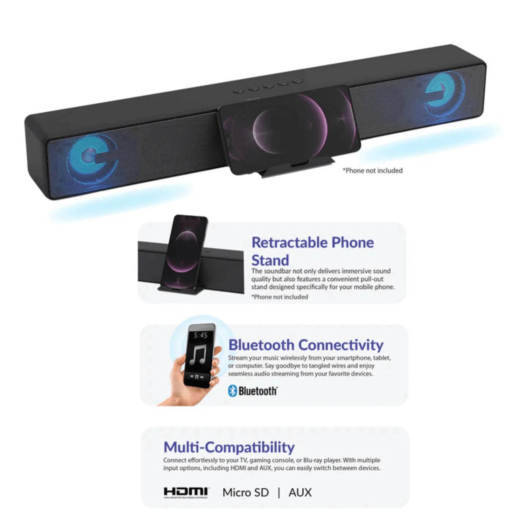 This Supersonic 2.0 channel portable Bluetooth soundbar delivers powerful sound in a slim 2.37" low-profile design that fits neatly in front of your TV without blocking the screen. Equipped with Bluetooth 5.3 for up to 10M wireless range, it easily connects to your Bluetooth-enabled devices and also supports Micro SD, AUX, and HDMI ARC inputs for versatile playback options. The built-in microphone works with Siri and Google Assistant for hands-free control, while LED RGB lights add a fun visual touch. Enjoy FM radio, play audio directly from a MicroSD card, or connect external devices via the 3.5mm aux input. With an HDMI input for seamless TV connection, a retractable phone stand, and a convenient 5-button top control panel, this soundbar is the perfect blend of style, functionality, and entertainment.