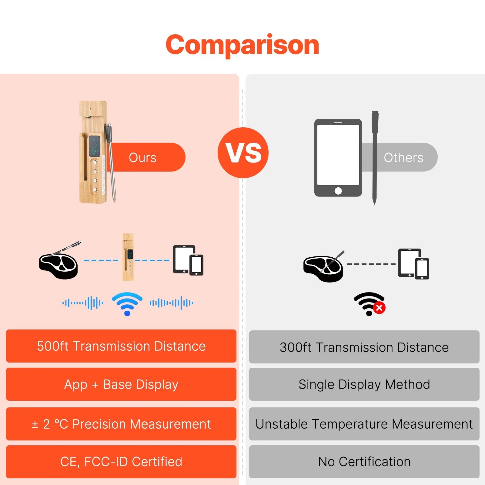 Built with a digital NTC+ chip, this wireless meat probe has a precision of ¡_?2¡ãC. Use the app's preset options to cook beef, lamb, turkey, pork, and more to their ideal flavor.